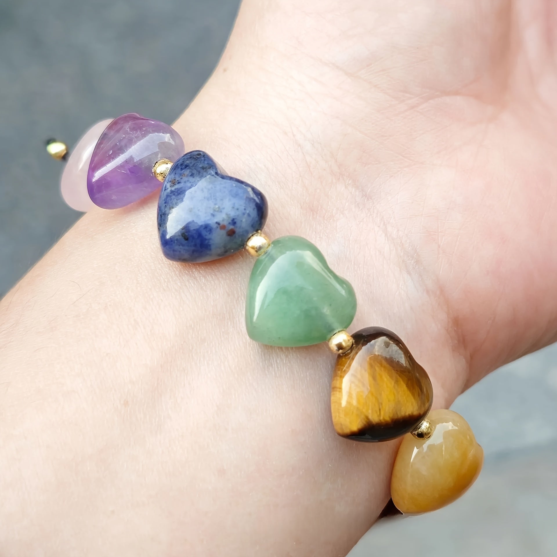 This handmade bracelet features seven natural heart-shaped crystals, each representing one of the body’s chakras — bringing balance, positivity, and emotional harmony.